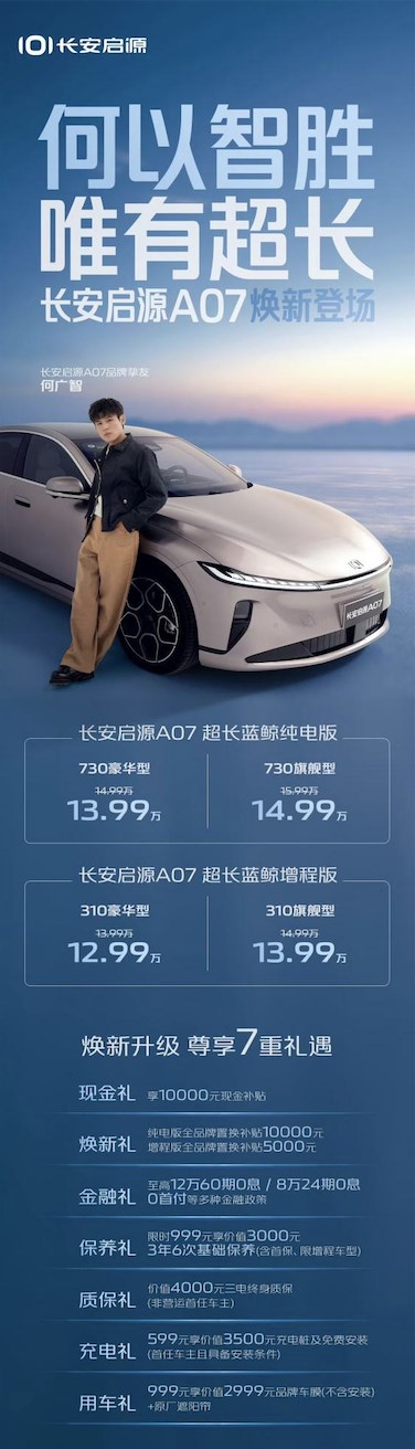 9月10日,長(zhǎng)安啟源A07超長(zhǎng)藍(lán)鯨純電版/增程版煥新登場(chǎng),共推出4款車型,長(zhǎng)安啟源A07超長(zhǎng)藍(lán)鯨純電版 730豪華型、730旗艦型售價(jià)為13.99萬(wàn)元、14.99萬(wàn)元;長(zhǎng)安啟源A07超長(zhǎng)藍(lán)鯨增程版310豪華型、310旗艦型售價(jià)為12.99萬(wàn)元、13.99萬(wàn)元,并提供七重誠(chéng)意大禮,全面滿足用戶對(duì)于越級(jí)價(jià)值的需求。